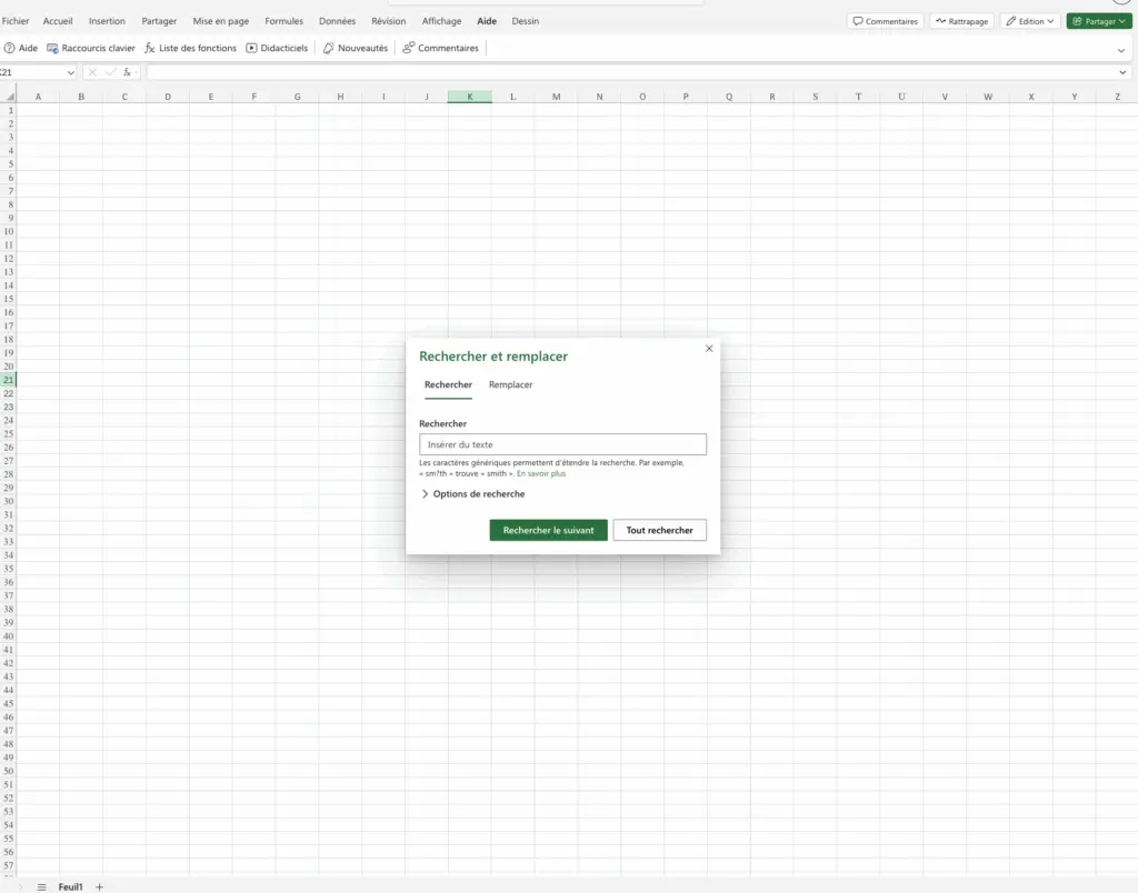 Lorsque les tableaux deviennent complexes, une recherche simple peut ne pas suffire. Excel propose alors des options avancées accessibles depuis la fenêtre Rechercher.