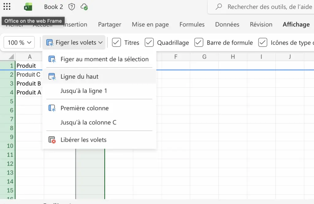 Rendez-vous dans l’onglet Affichage situé en haut de l’écran. Dans le groupe Fenêtre, cliquez sur Figer les volets, puis choisissez à nouveau Figer les volets dans le menu déroulant.