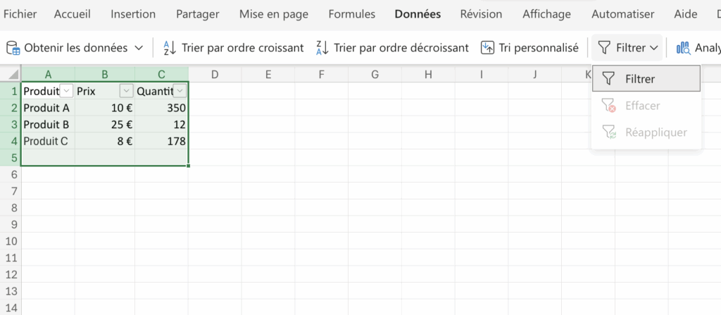 Un filtre actif peut donner l’impression que certaines données ont disparu. En réalité, elles sont simplement masquées. Avant toute modification importante, vérifiez toujours si un filtre est appliqué afin d’éviter des erreurs d’interprétation.