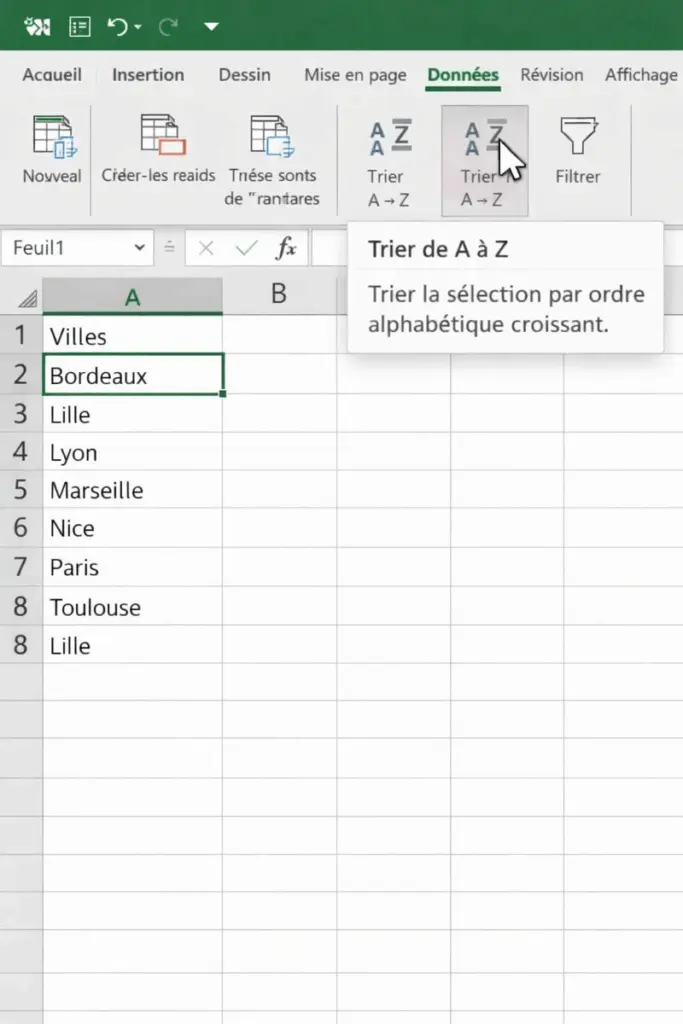 Il suffit de cliquer sur une cellule de la colonne à trier, puis d’accéder à l’onglet Données dans le menu supérieur. Les boutons de tri permettent alors de classer les données de A à Z ou de Z à A.